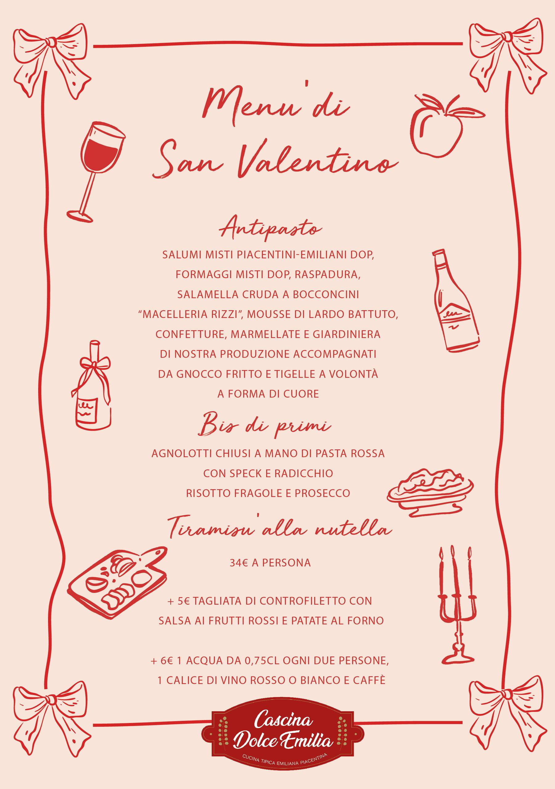 Week-end a Carpiano Gennaio 21, 2026 Published by Valentina on Febbraio 6, 2026 Categories Uncategorized Tags Menu di San Valentino Antipasti 💗 Salumi misti Piacentini-Emiliani DOP, Formaggi misti DOP, Raspadura …… 💗 Salamella cruda a bocconcini “Macelleria Rizzi” …… 💗 Mousse di lardo battuto …… 💗 Confetture, marmellate e giardiniera di nostra produzione Accompagnati da gnocco fritto e tigelle a volontà a forma di cuore Bis di Primi 💗 Agnolotti chiusi a mano di pasta rossa con speck e radicchio …… 💗 Risotto fragole e prosecco Dolce 💗 Tiramisù alla nutella 34€ A PERSONA + 5€ Tagliata di controfiletto con salsa ai frutti rossi e patate al forno + 6€ 1 Acqua da 0,75cl ogni due persone, 1 calice di vino rosso o bianco e caffè PRENOTA CASCINA DOLCE EMILIA …💗… Share 0 Valentina Related posts Gennaio 21, 2026 Week-end a Carpiano Read more Dicembre 11, 2025 Dicembre alla Cascina Dolce Emilia Read more Novembre 10, 2025 Panettoni artigianali a Carpiano Read more Comments are closed.